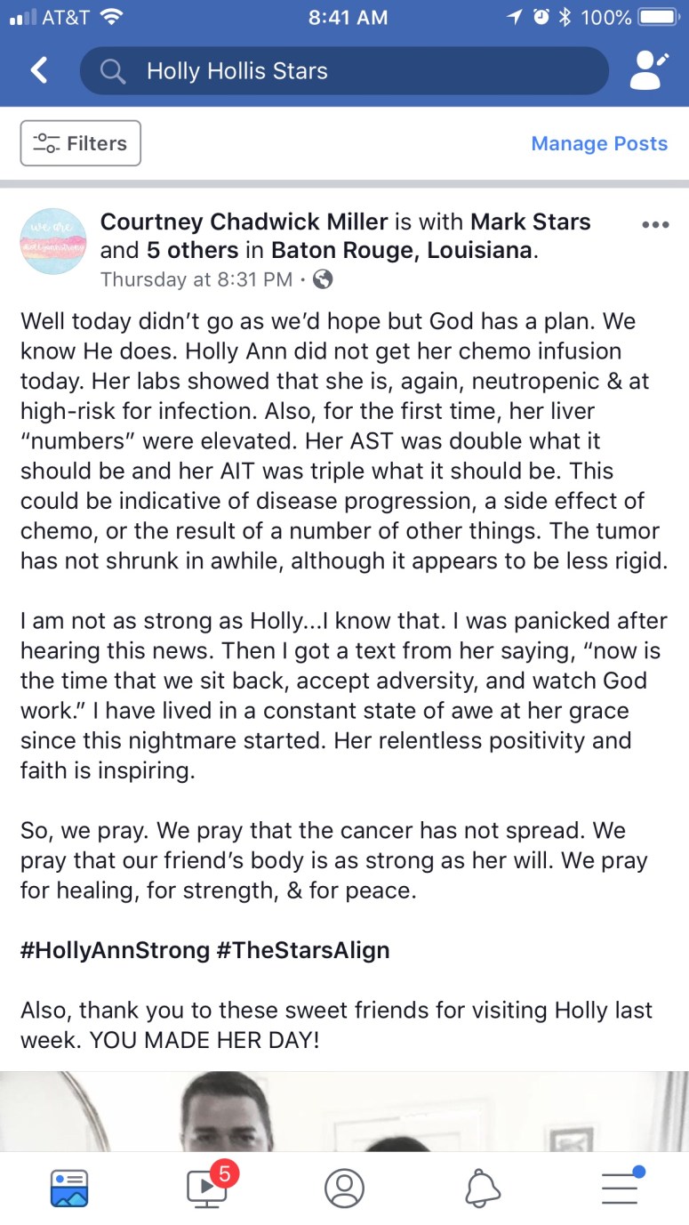 Good morning friends! Many of you probably know that I wasn’t able to get chemo last week because some of my “numbers” were too low. (The doctors draw blood before chemo each time and look at all kinds of things to determine if my body is healthy enough to receive chemo.) (I’ll attach a picture of the update from last week that will explain the numbers issue).