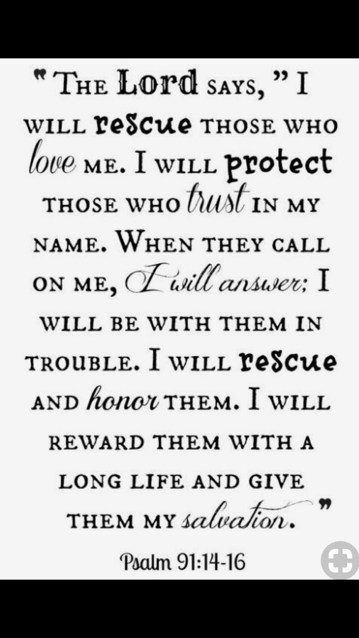 “The Lord says, I will rescue those who love me. I will protect those who trust in my name. When they call on me, I will answer. I will be with them in trouble. I will RESUE and HONOR them. I will reward them with a LONG life and give them my salvation.”