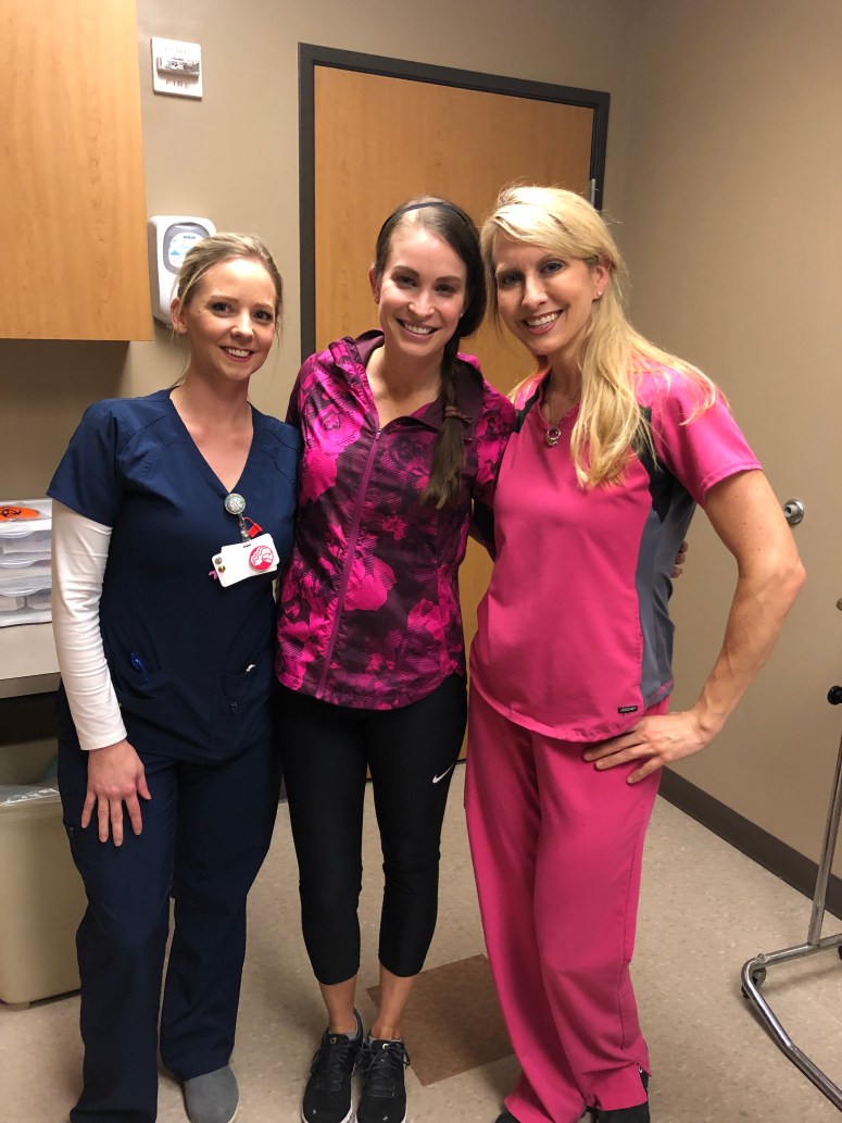 Amazing. Free. Wonderful. J I hope and PRAY so hard that I will not ever need another one.  (Again, for those handing out prayers….that’s pretty high on the list!) J A lot of my friends wanted to know what the port removal process was like.  (Forgive me if I’ve already discussed this, I can’t remember)- but it really wasn’t bad at all.  If you know me, you are well aware that I’m a HUGE baby when it comes to needles…..and I can be well, a “tad” high strung.  (I believe the kids would call that “extra”).  Even with all of my shenanigans and having to take my port out at the VERY end of a long day, Dr. Bowie (and her nurse Heidi) were SO gentle and patient with me.  They were so nice to me it honestly made the procedure easy.  My friend Lauren Fairbanks came with me for my “deportation” which was nice.  I can’t stand the sight of blood so I didn’t look at anything during the procedure…..but Lauren calmly held my hand, chatted with me, and watched all of it (she was given the choice to sit outside for the record!).  Tip: if you’ve just been diagnosed it helps to go ahead and identify which friends are “good” with blood, needles, and medical things.  They REALLY come in handy!   Pic below was taken right after my port was removed earlier this month.  A big day!!