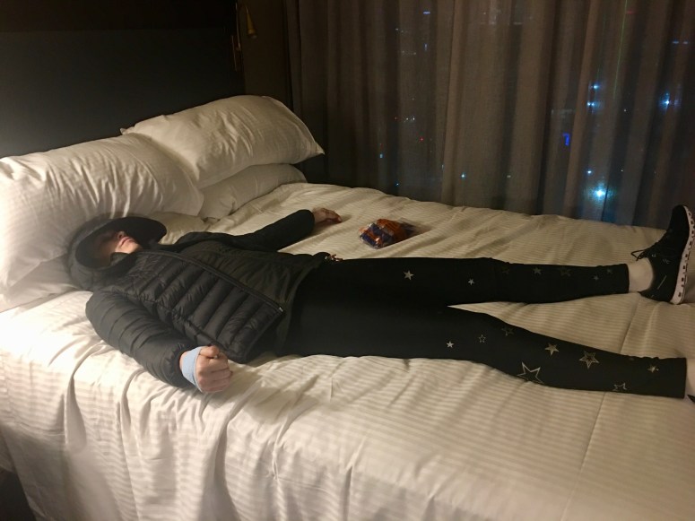 Fast forward a few hours later after the surgery, my doctor told us “I had to work REALLY hard to get any fat from your back….you’re going to be in pain for awhile”. Well, technically he told my mom this, I don’t remember anything right after surgery except eating 42 graham crackers and trying to take a selfie with mom to no avail. I also remember going home wearing knee high “compression socks” to prevent blood clots which felt wrong…..SO. WRONG. I remember feeling claustrophobic with so many things squeezing me at one time. Surely I’m not the only one who felt that way post surgery? Illustration: Exhibit A.