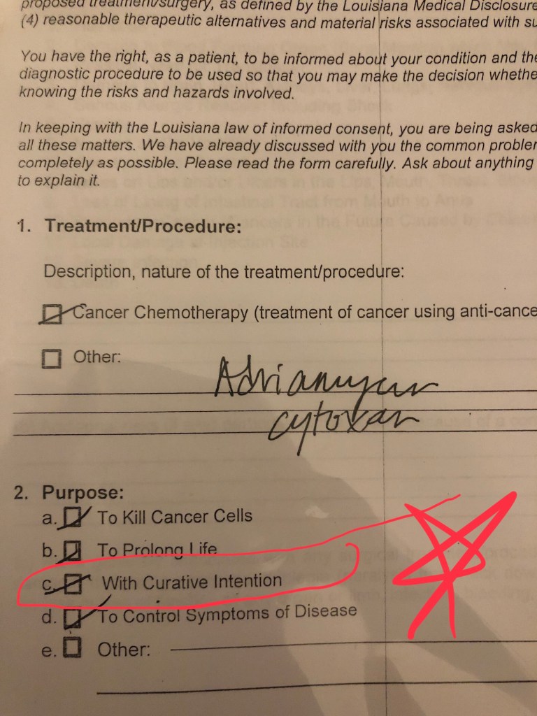 At some point during my treatment (which consisted of 8 months of IV chemo, a double mastectomy, 33 rounds of radiation, and 6 more months of Xeloda oral chemo) the doctors changed my “chemo contract” from “prolonging life” to “CURATIVE INTENTION”.