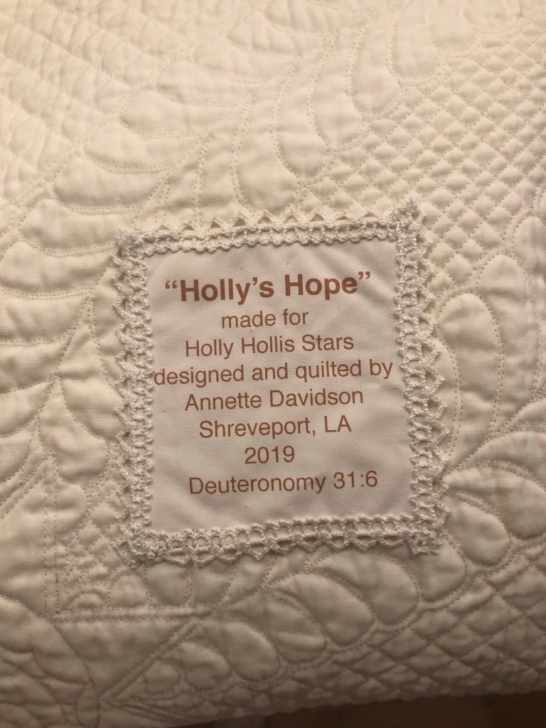 Wow. I cried the whole time while reading this blog. Our whole family is so thankful to our Lord for bringing Holly to her 2 year anniversary of NEAD. Looking back over the last 2 years, I see how HE has achieved his purpose through so many people from family, friends from the past, present, new friends And strangers that have never even met Holly but has prayed for her continuously. People have brought food, gifts, cards, supplies, companionship, financial help, gone with her to chemo treatments, doctor’s appointments and on and on. So much love and support has been poured out to Holly and Mark. I want to especially thank my friend Annette Davidson for the Special, Special Holly’s Hope quilt. I know that she prayed over Holly each time she planned and worked on the quilt. Her husband Ricky is a runner and he shared with us that he prayed for Holly each morning run. God has honored all your prayers by continuing to heal Holly’s body. It’s been a very tough 2 years, but look what God gave in return. As my eldest sister Glenna says, “ What the devil meant for harm God turns around for good.“
