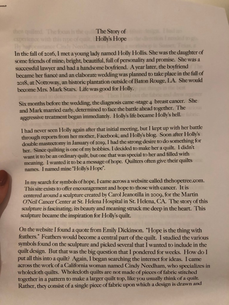 I can’t even begin to list all of the amazing gifts I received over the last two years. I’m still in awe of how God works through people. The picture above is of a quilt my mom’s friend made me. She handed me the story below right before she gave me the quilt.